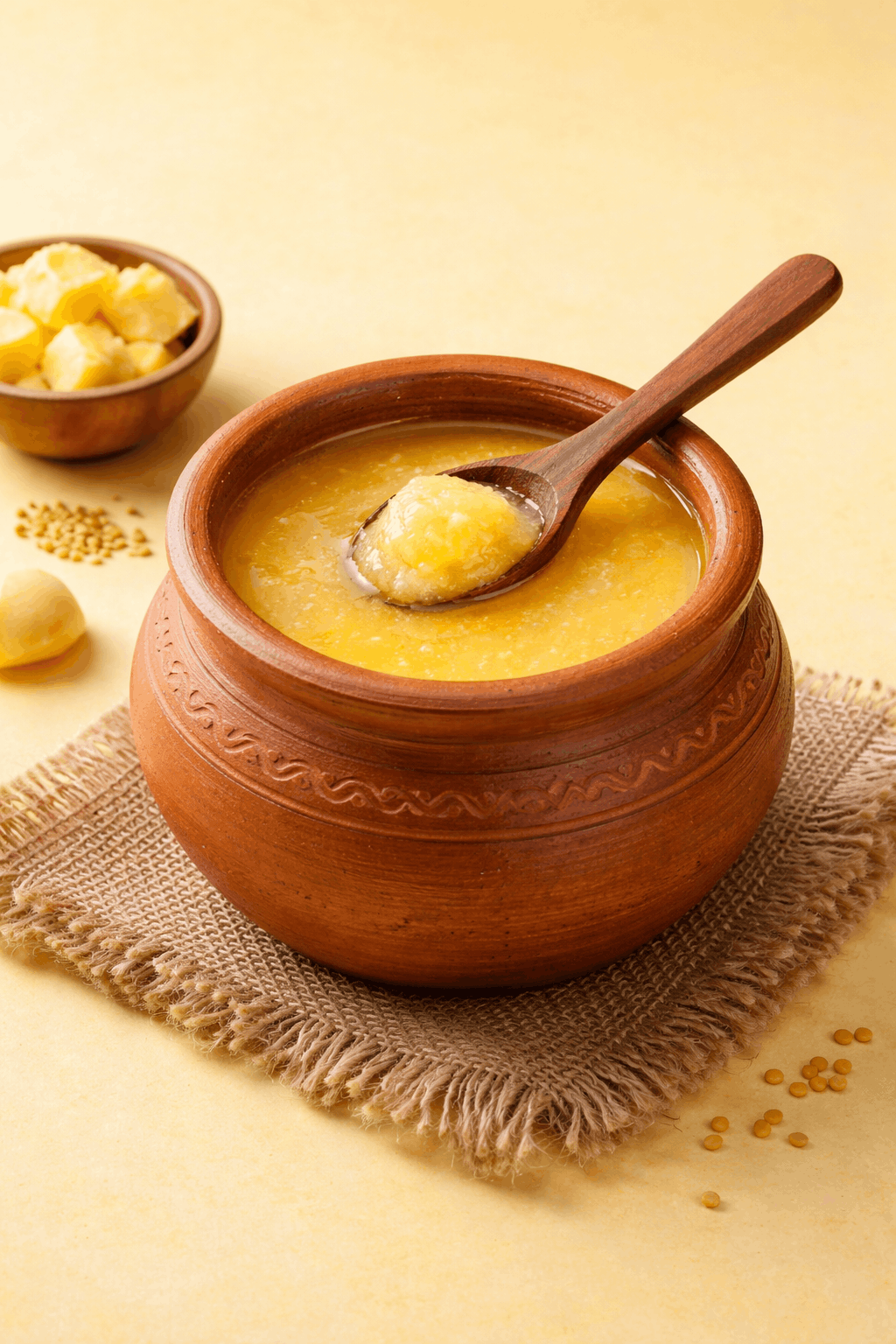 Included of all taxesWhat You're Getting This is ghee made the way it used to be made in Indian homes, before convenience took over quality. We start with fresh milk from desi cows, turn it into curd overnight, hand-churn it the next morning, and slow-cook the butter until it becomes pure golden ghee. It takes longer. It takes effort, but that’s what we do. But it's the only way to get ghee that actually tastes like ghee should, light on the stomach, rich in aroma, and pure enough that one spoonful reminds you of home. Good for daily cooking. Safe for children and elders. Easy to digest, even if you usually have trouble with dairy.
